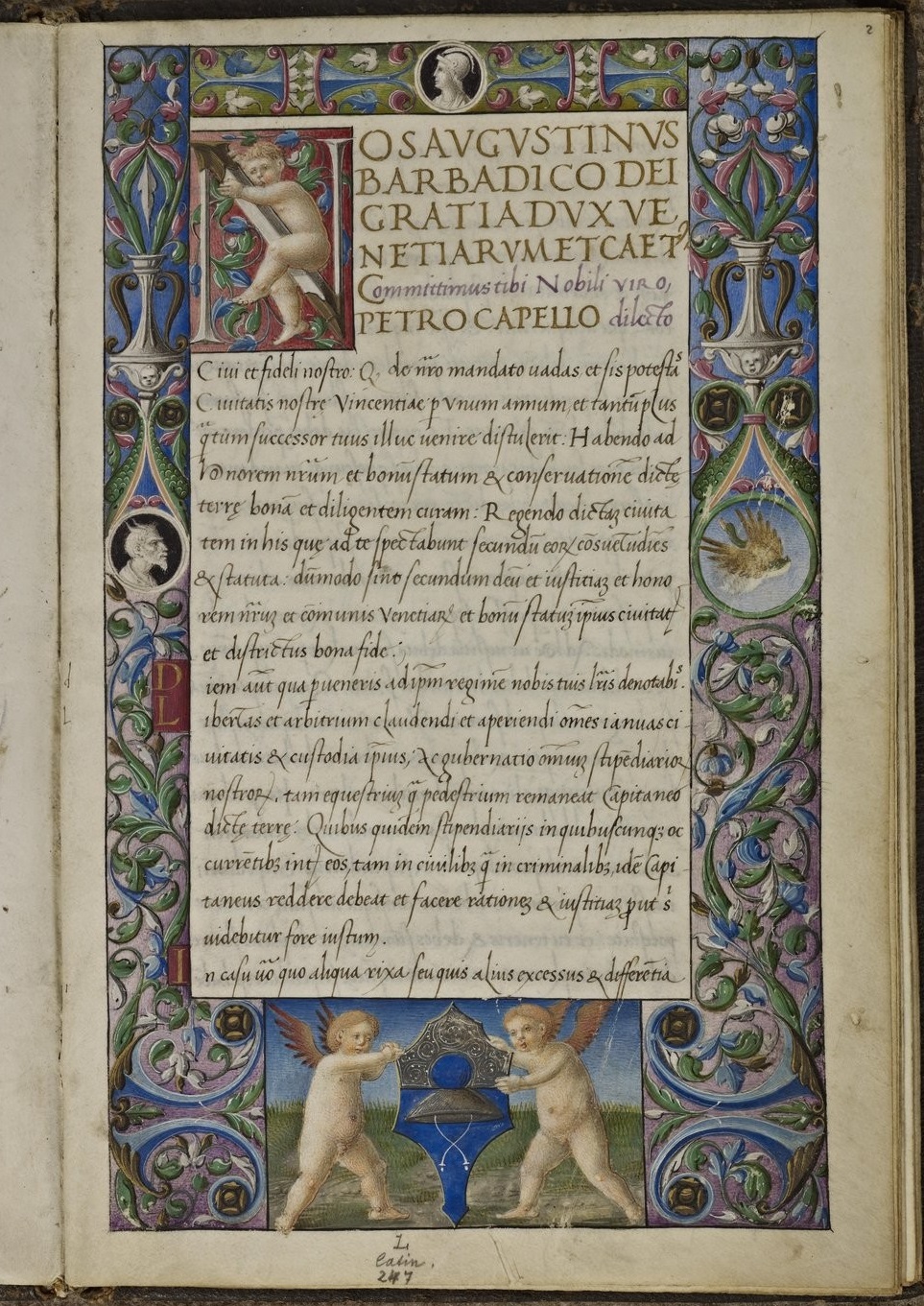 Le décor est fait de motifs végétaux qui enserrent des médaillons imités des camées antiques : l’un représente une tête casquée de Minerve, l’autre celle d’un faune. Un canard s’envole sur un troisième médaillon, représenté au naturel, vu du dessus. Ces motifs sont inspirés des grotesques romaines. La belle lettrine est « habitée », car un putto (sans ailes) s’y trouve aux prises avec la lettre elle-même, un N. Il semble vouloir grimper dessus au risque de s’y blesser, car le rendu de la lettre évoque un instrument coupant. Les six premières lignes du texte sont écrites en totalité ou en partie en capitales romaines à l’or et une brève insertion à l’encre violette les complète. Les armoiries parlantes de Pietro Capello sont figurées au bas de ce premier feuillet, soutenues par deux autres putti ailés, bien joufflus.